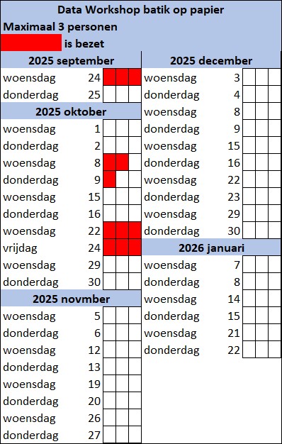 - Groepsgrootte: Maximaal 3 personen. (Bij 2 aanmeldingen gaat de workshop door)