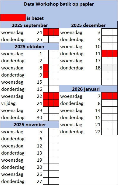 - Workshops vinden plaats van 28 september 2025 tot en met 25 januari 2026. op woensdag en donderdag. Bij een dag is de workshop op woensdag.